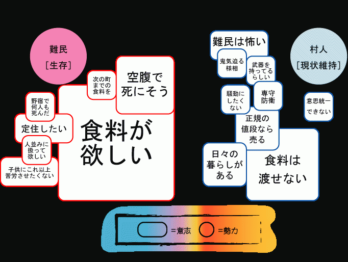 また、上図のとおり勢力が向かい合った形で描かれている場合、相手勢力に近いものほど言動に表れやすく、遠いものほど秘めた意志となります。(この辺は勢力ごとにエイミングマップを作ることもあるので、マチマチです)